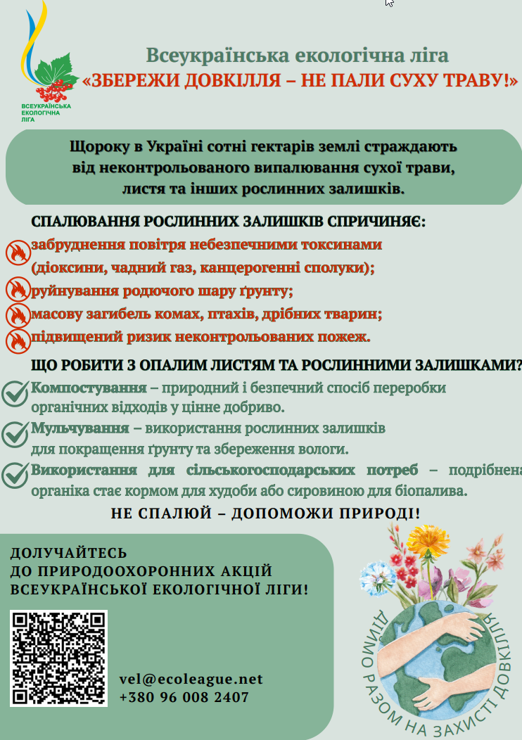 Всеукраїнська екологічна ліга «ЗБЕРЕЖИ ДОВКІЛЛЯ – НЕ ПАЛИ СУХУ ТРАВУ!» Опубліковано 29.04.2025 0 Департамент ЖКГ Published in Новини ДЖКГ and Оголошення(анонси)